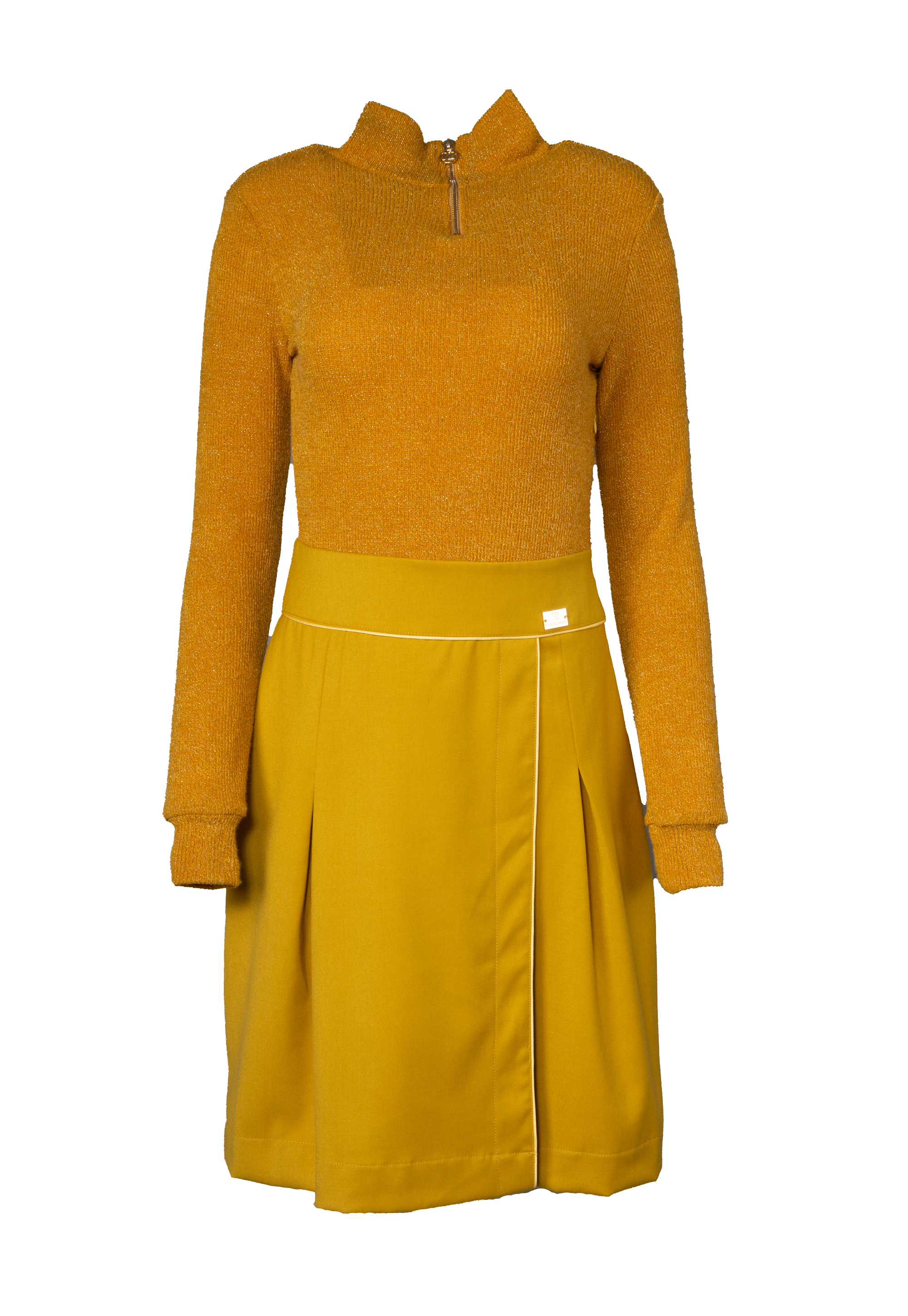 Haljina u obliku pulovera i suknje, gornji dio je protkan sjajnim nitima, ima visoku kragnu, a naprijed se kopča patentnim zatvaračem, haljina je dužine do koljena