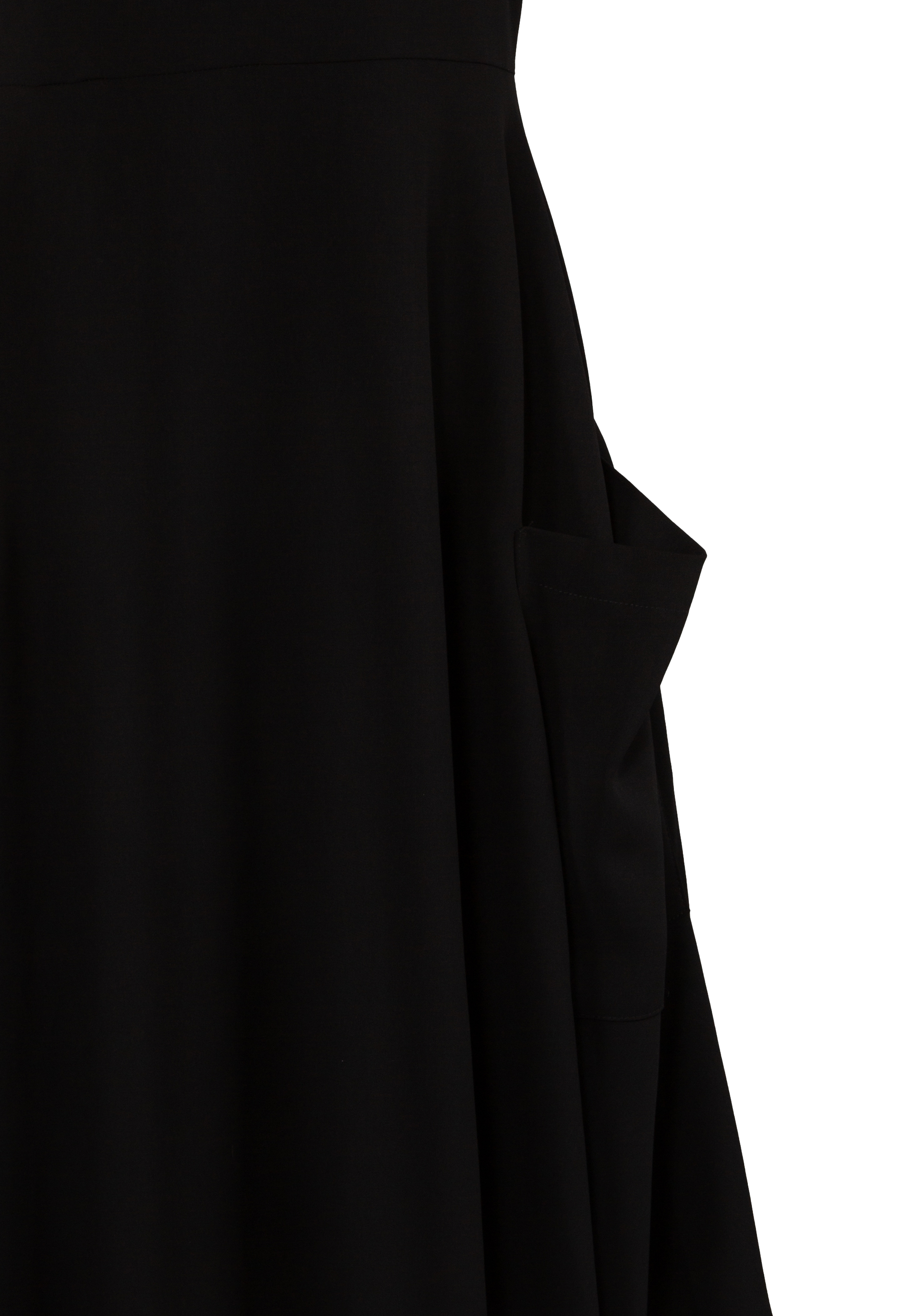 Black sleeveless knee-length dress with V-neckline and large pockets